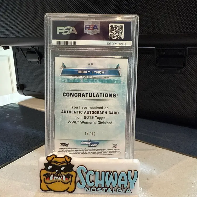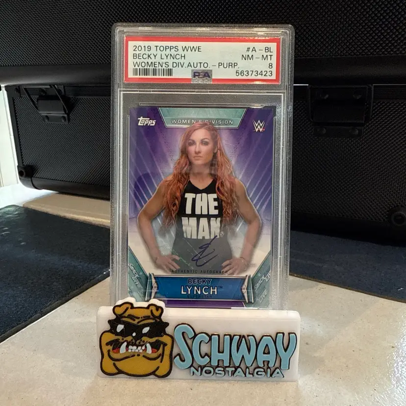 The product is a 2019 Topps WWE Women's Division autographed trading card featuring Becky Lynch. This card is serial numbered 48/99 and has received a PSA 8 grade with a population of 1, making it the highest graded in existence. Autographed by Becky Lynch with a label or sticker, this single card is an original release from Topps and is a valuable collector's item for fans of wrestling and WWE.