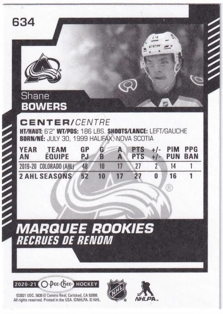 2020-21 O-Pee-Chee #634 Shane Bowers RC Colorado Avalanche