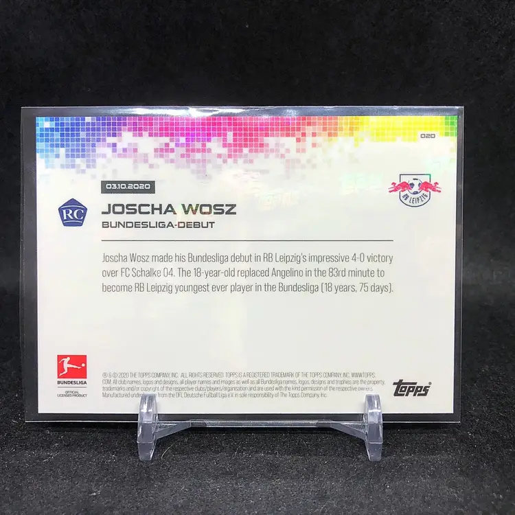1st time buyer? Get $5 Off with code DISTRICT5 at checkout! Card as shown. All cards $20 and under ship PWE via lettertrackpro [https://www.letter-track.com/registerap.asp?AFID=8757] Set: Base Card Number: #20 Season: 2020 Player/Athlete: Joscha Wosz Grade: Ungraded Sport: Soccer Card Manufacturer: Topps Card Attributes: Rookie Brand: Bundesliga Team: RB Leipzig League: Bundesliga Original/Reprint: Original Product: Single Player: JOSCHA WOSZ Print Run: 892 Year: 2020-21