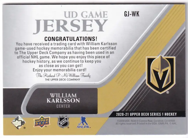 2020-21 Upper Deck Game Jerseys #GJWK William Karlsson Vegas Golden Knights