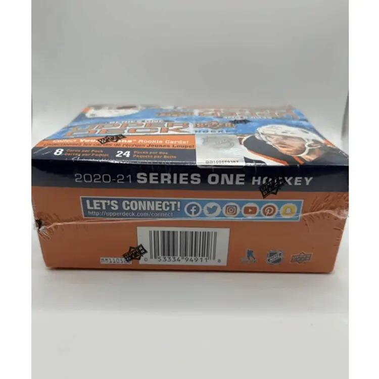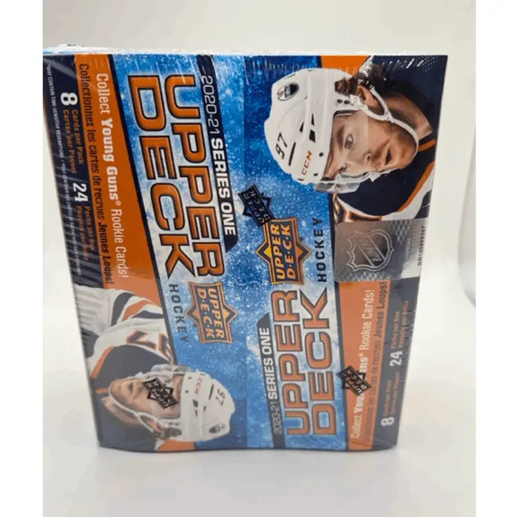 2020/2021 Upper Deck Series 1 Hockey Retail Box, 24 packs, 8 cards per pack. Look for rookies including: Alexis Lafreniere, Jason Robertson, and many more...