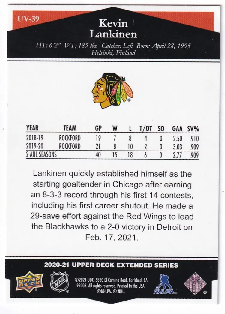 2020-21 Upper Deck Ultimate Victory #UV39 Kevin Lankinen Chicago Blackhawks