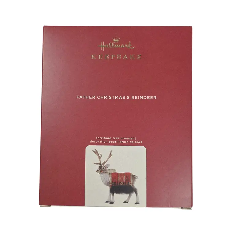 Welcome the wonder of the season with this handsome Christmas tree ornament. The regal reindeer carries an ornate red-and-gold fabric saddle blanket that's trimmed with black faux fur and adorned with ribbon and gem accents. Coordinating 2020 Father Christmas ornament (sold separately). • Limited edition 2020 • Artist Joanne Eschrich • Size approx 4.75" W x 5.29" H x 1.97" D New in the original box. Original box may have minor wear due to storage.