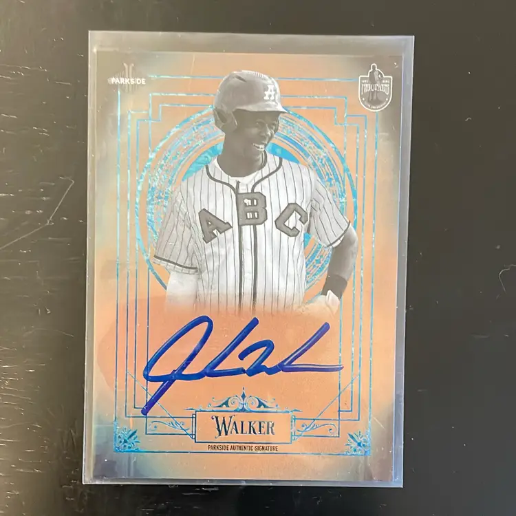 A Blue parallel (only 10 made, not numbered) on card autograph of Cardinals prospect Jordan Walker from the Parkside NLBM set.