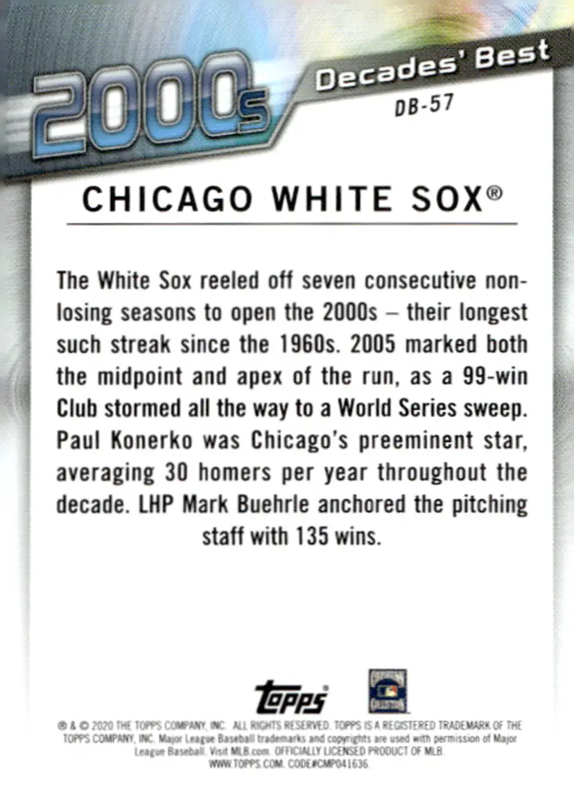 1st time buyer? Get $5 Off with code DISTRICT5 at checkout! Card as shown. All cards $20 and under ship PWE via lettertrackpro [https://www.letter-track.com/registerap.asp?AFID=8757] Sport: Baseball Set: 2020 Topps Update Card Name: Chicago White Sox - Chicago White Sox Card Number: DB-57 Player/Athlete: Chicago White Sox Team: Chicago White Sox