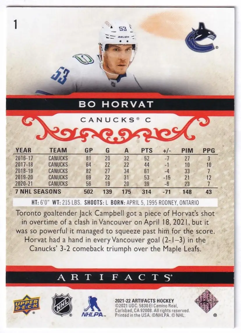 2021-22 Artifacts Ruby #1 Bo Horvat Vancouver Canucks Print Run - 499