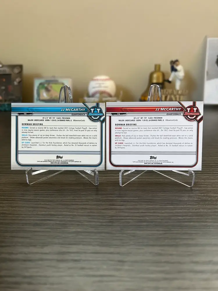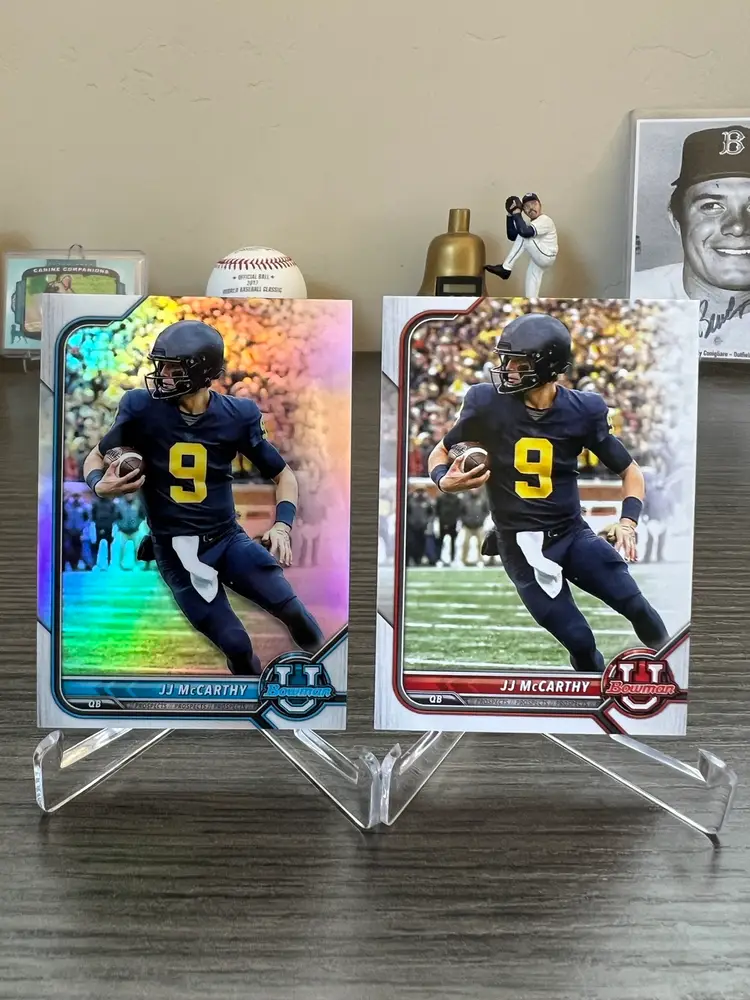 2022-22 Bowman University JJ McCarthy Pre-Rookie 2 Card Lot (Base Paper & Chrome Refractor) Card No. 79 Minnesota Vikings Michigan Wolverines