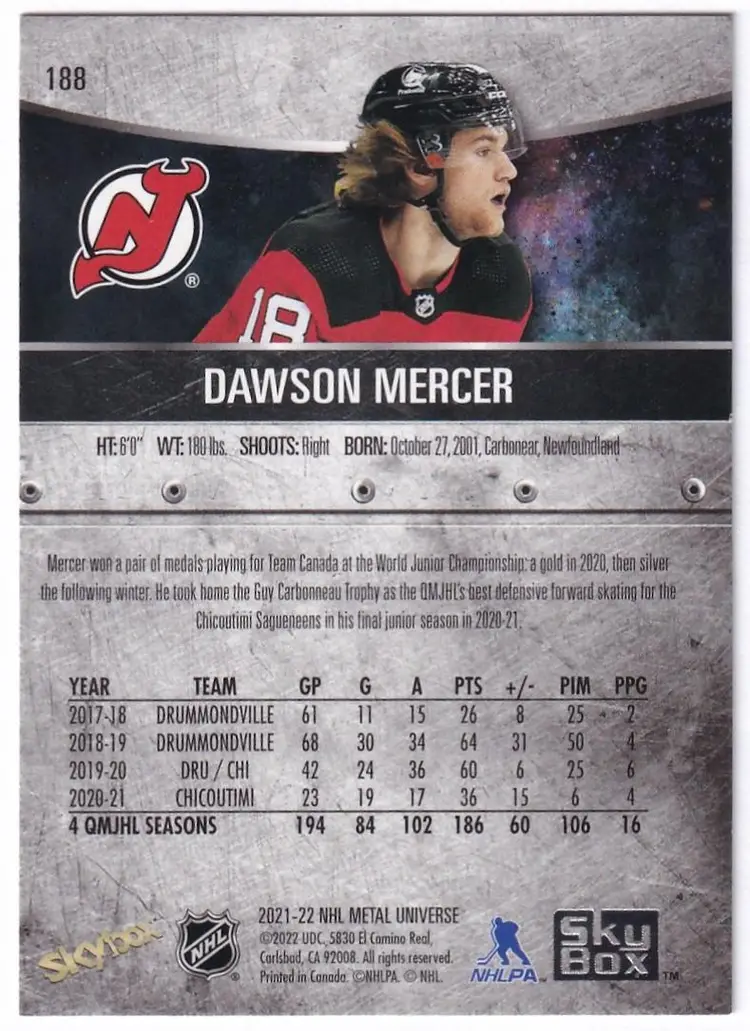 2021-22 Metal Universe #188 Dawson Mercer RC New Jersey Devils