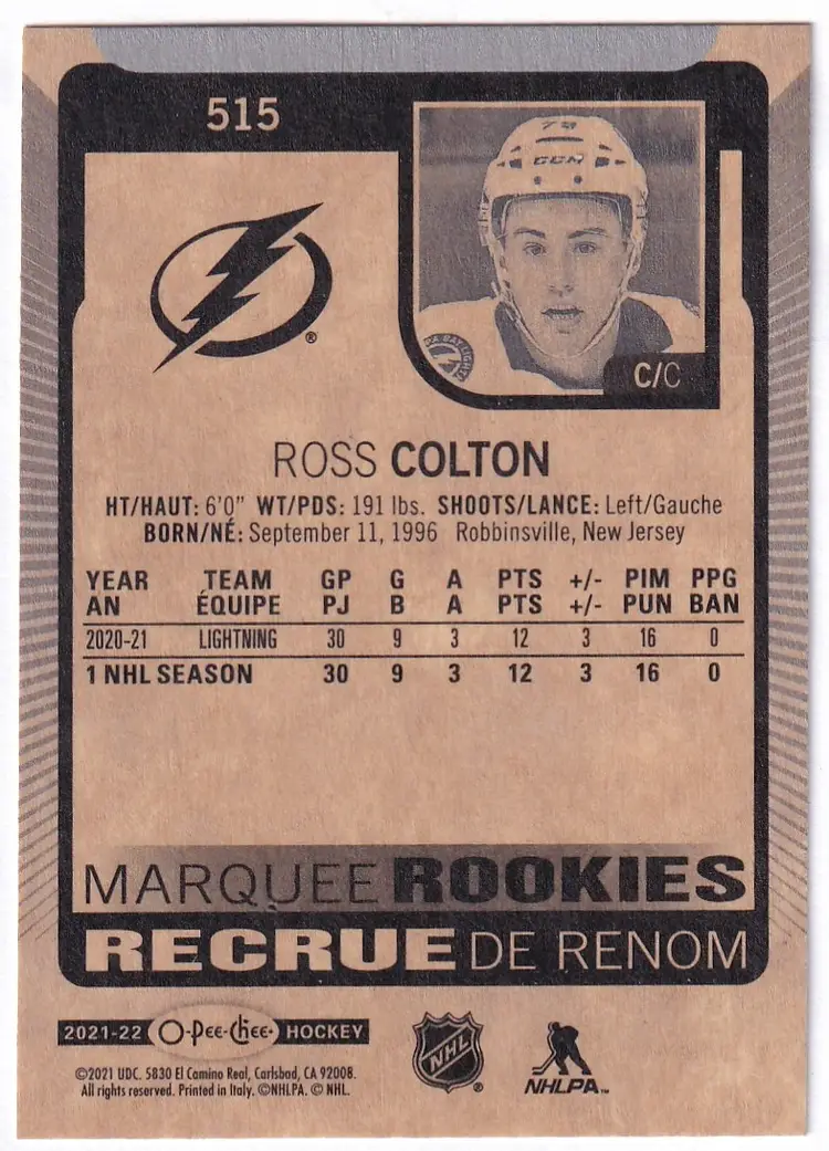 2021-22 O-Pee-Chee #515 Ross Colton RC Tampa Bay Lightning