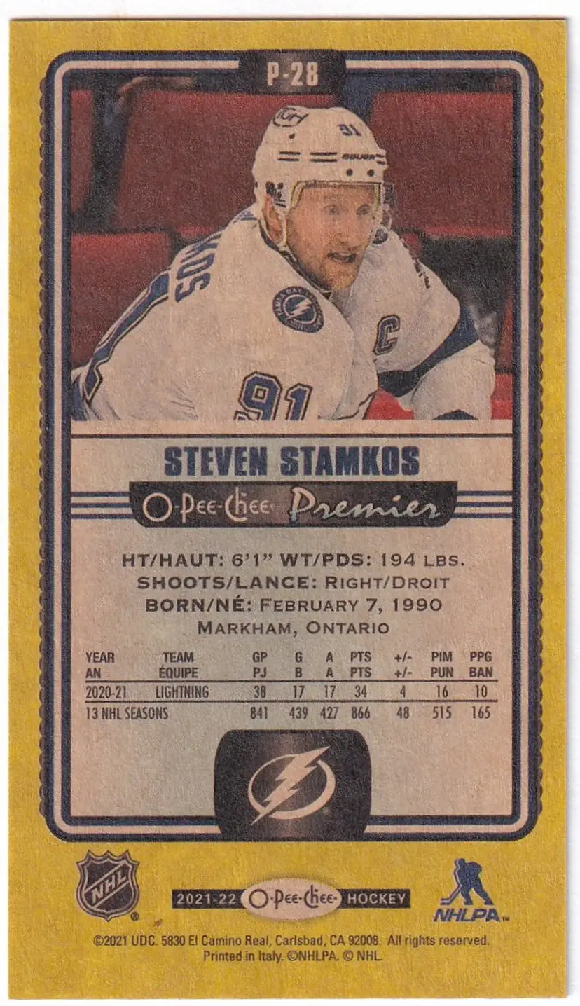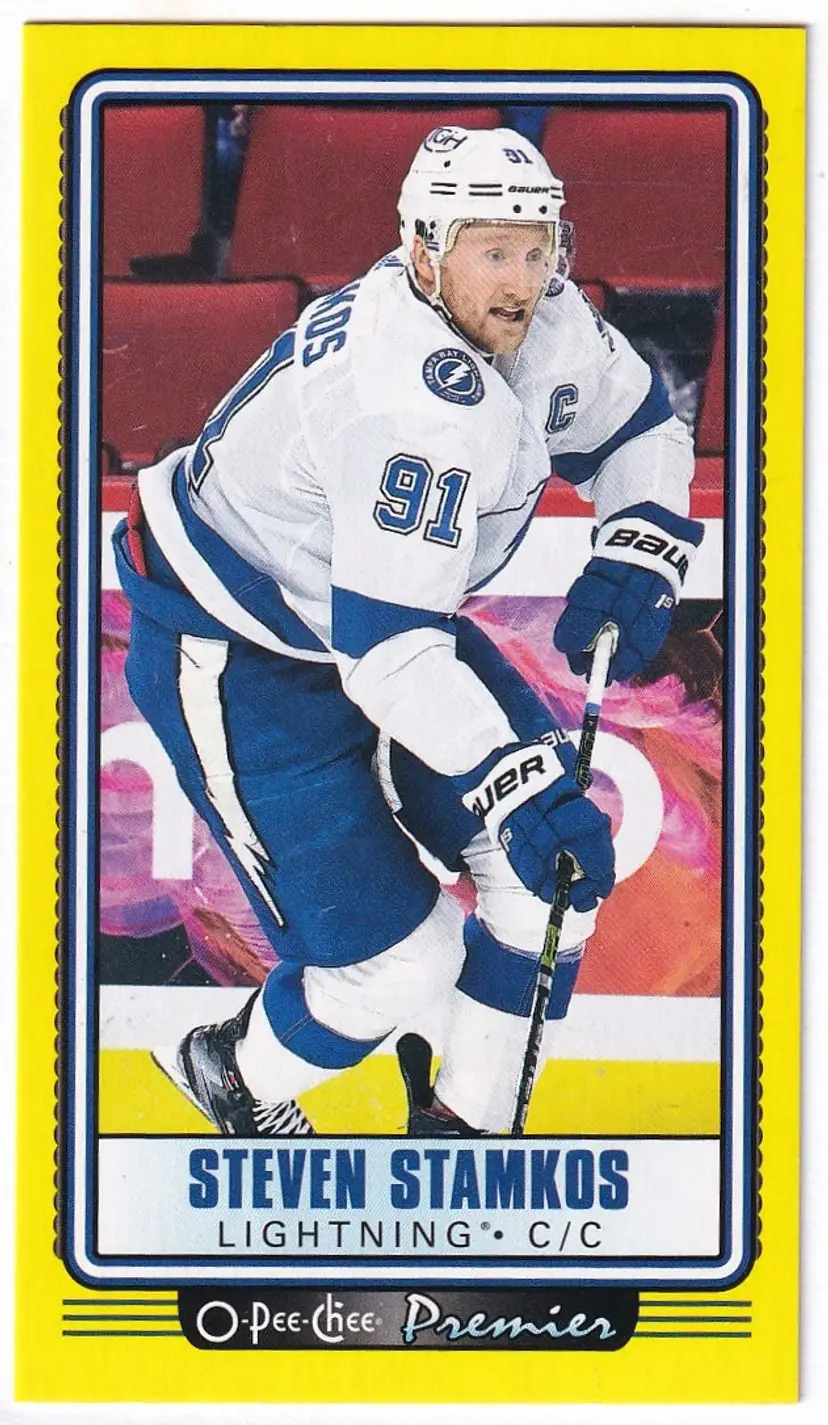 2021-22 O-Pee-Chee OPC Premier Tallboys Yellow #P28 Steven Stamkos Tampa Bay Lightning