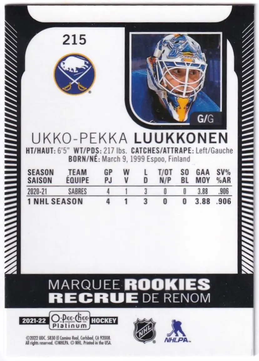 2021-22 O-Pee-Chee Platinum #215 Ukko-Pekka Luukkonen RC Buffalo Sabres