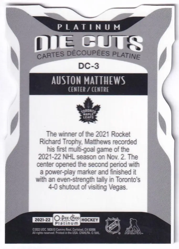 2021-22 O-Pee-Chee Platinum Platinum Die Cuts #DC3 Auston Matthews Toronto Maple Leafs