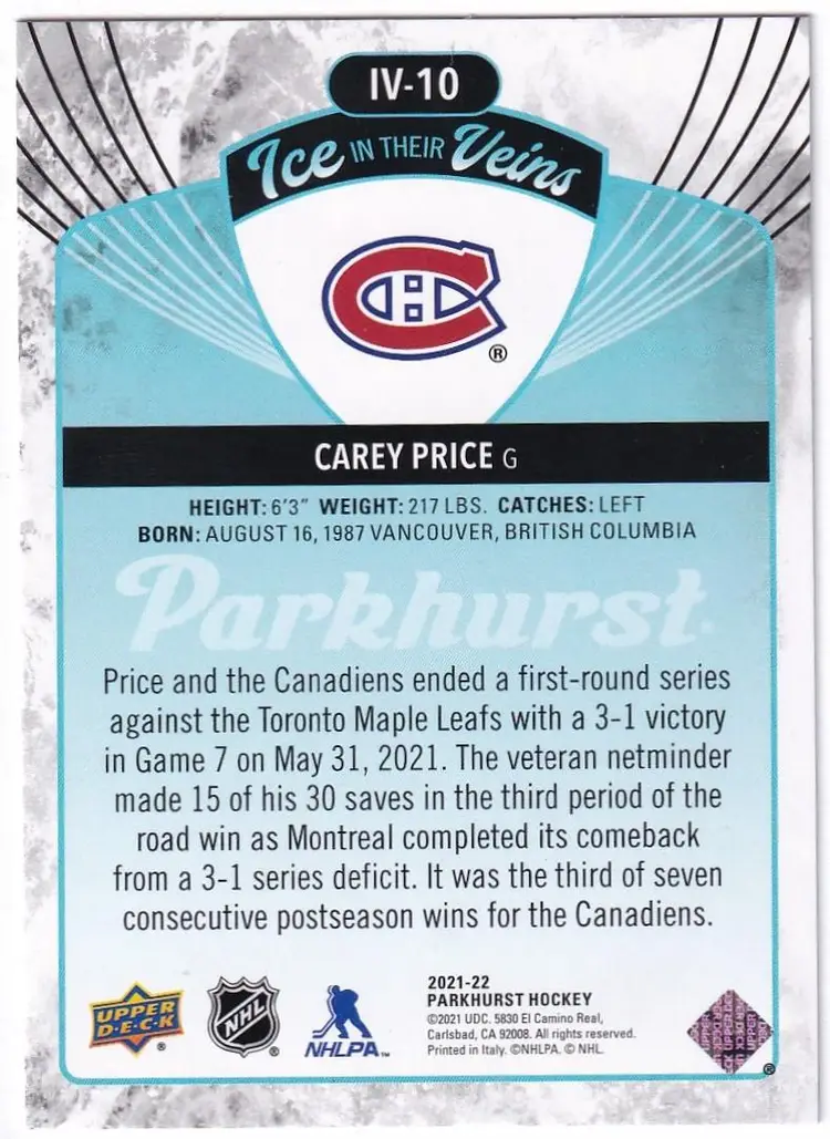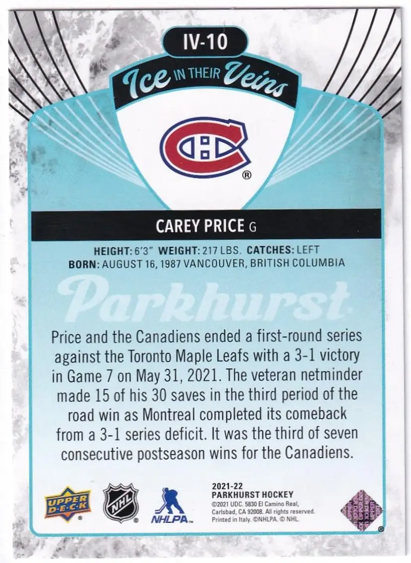 2021-22 Parkhurst Ice in Their Veins #IV10 Carey Price Montreal Canadiens