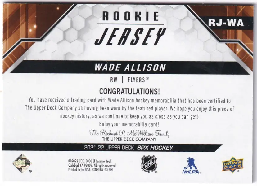 2021-22 SPx Rookie Jerseys #RJWA Wade Allison Philadelphia Flyers