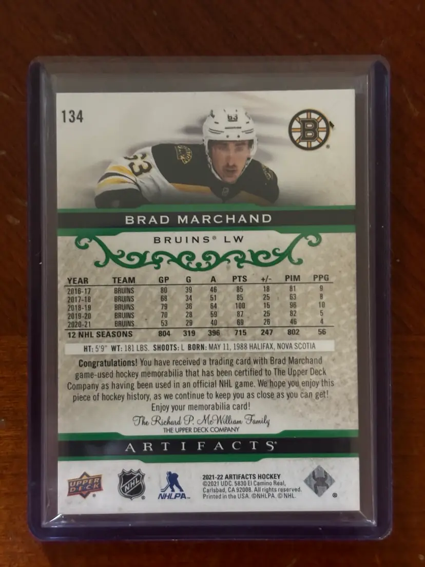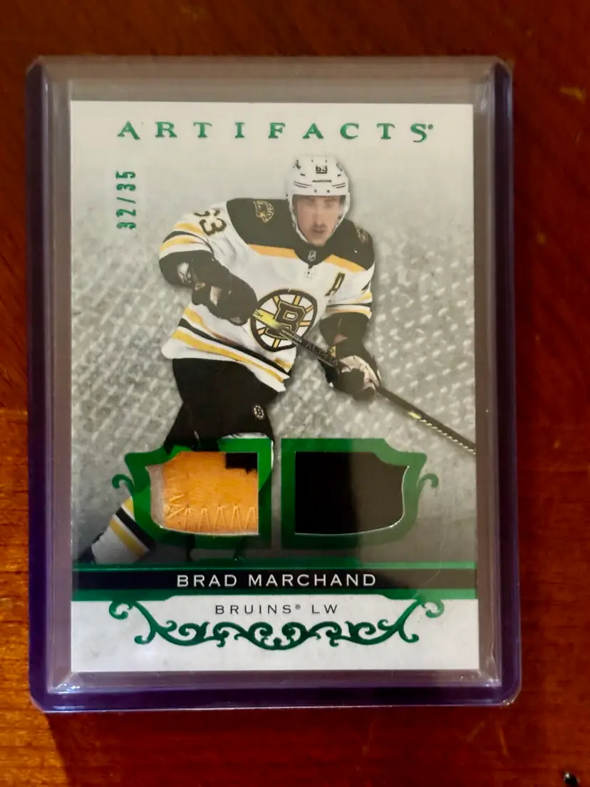 2021-22 Upper Deck Artifacts - Green Brad Marchand Dual Patch - Three Color /35 - #134
