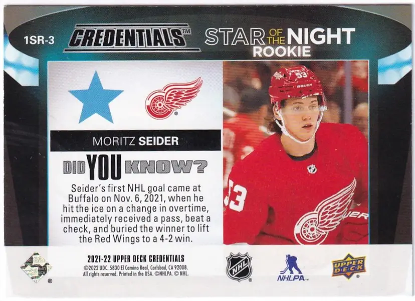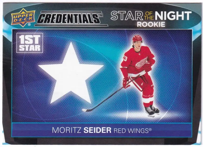 2021-22 Upper Deck Credentials 1st Star of the Night Rookies #1SR3 Moritz Seider Detroit Red Wings