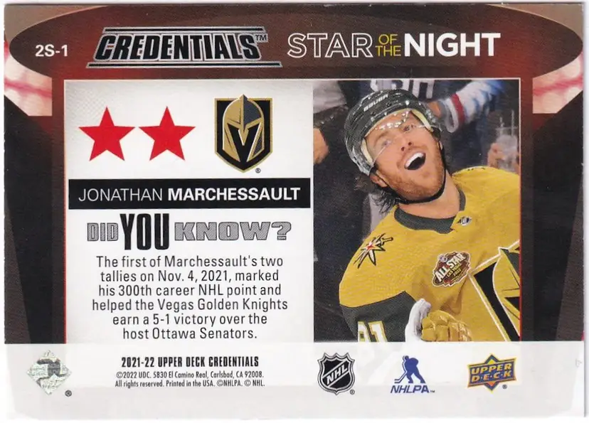 2021-22 Upper Deck Credentials 2nd Star of the Night #2S1 Jonathan Marchessault Vegas Golden Knights