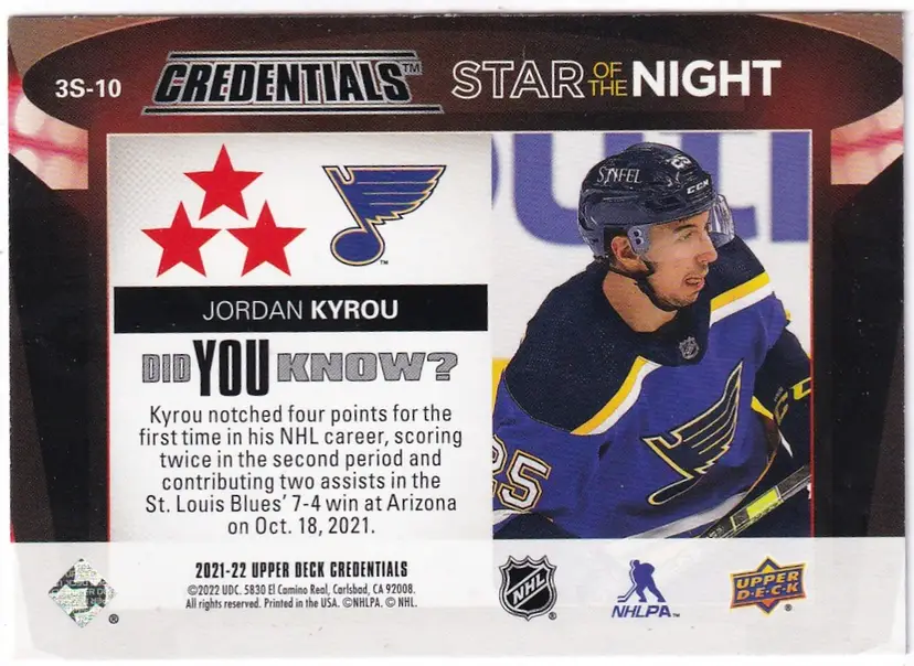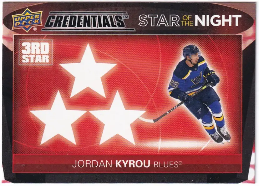 2021-22 Upper Deck Credentials 3rd Star of the Night #3S10 Jordan Kyrou St. Louis Blues