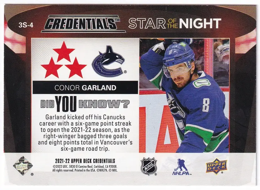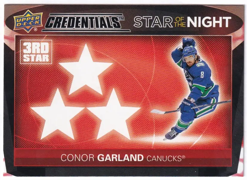 2021-22 Upper Deck Credentials 3rd Star of the Night #3S4 Conor Garland Vancouver Canucks