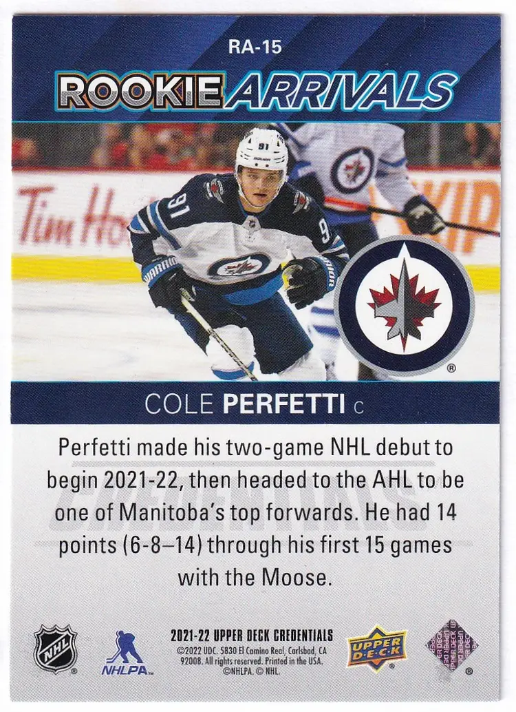 2021-22 Upper Deck Credentials Rookie Arrivals #RA15 Cole Perfetti Winnipeg Jets