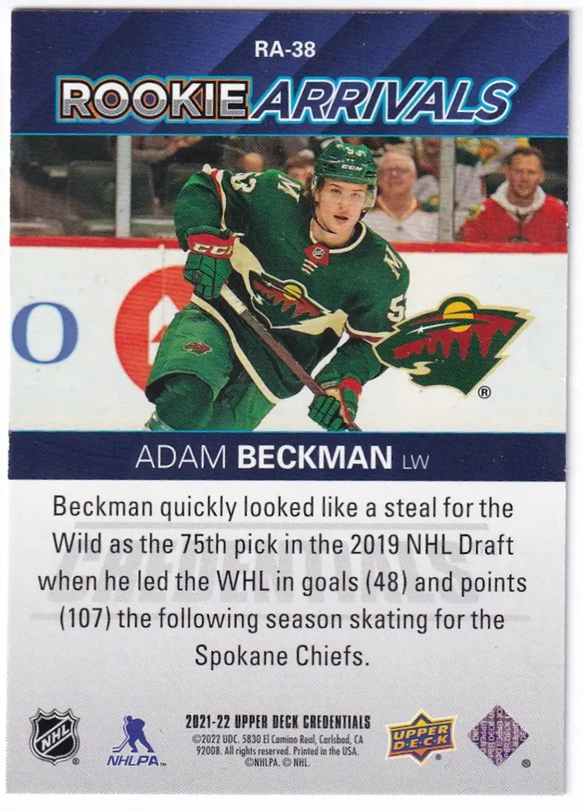 2021-22 Upper Deck Credentials Rookie Arrivals #RA38 Adam Beckman Minnesota Wild