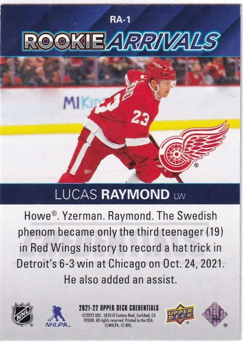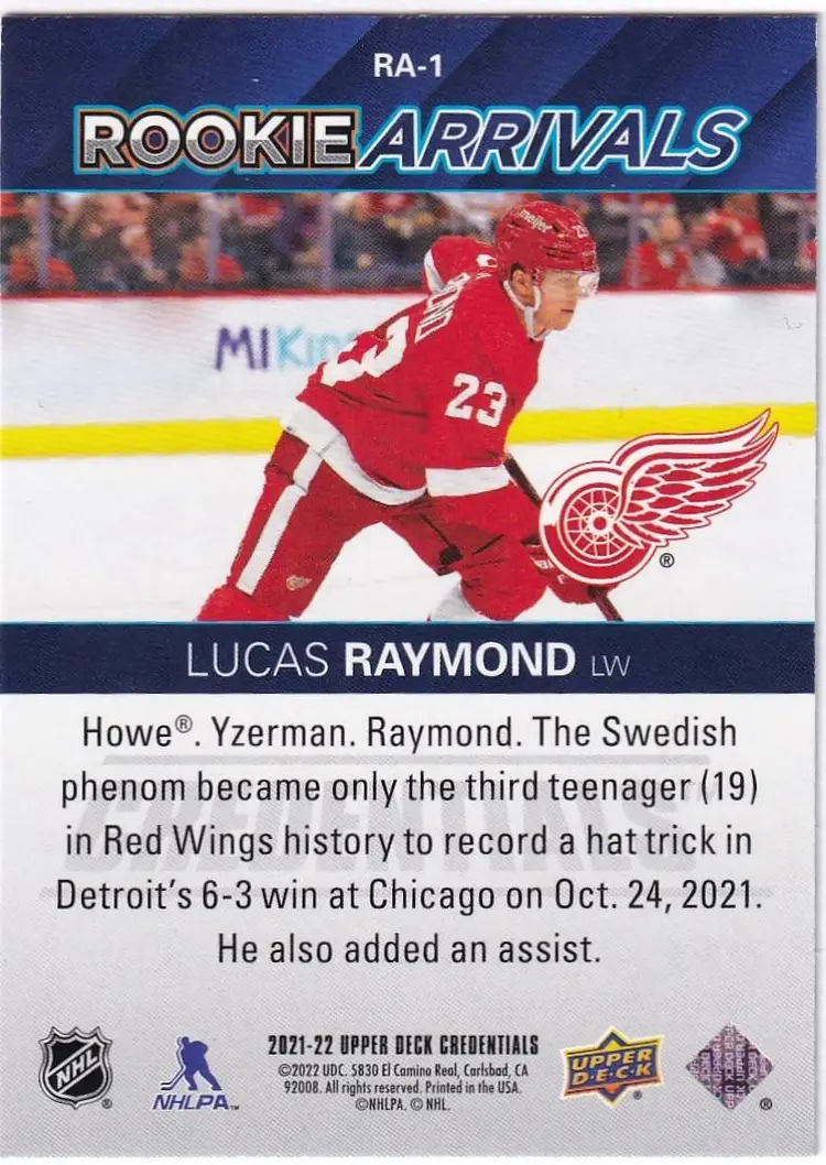 2021-22 Upper Deck Credentials Rookie Arrivals #RA1 Lucas Raymond Detroit Red Wings
