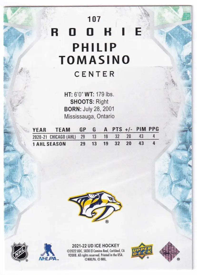2021-22 Upper Deck Ice #107 Philip Tomasino RC Nashville Predators