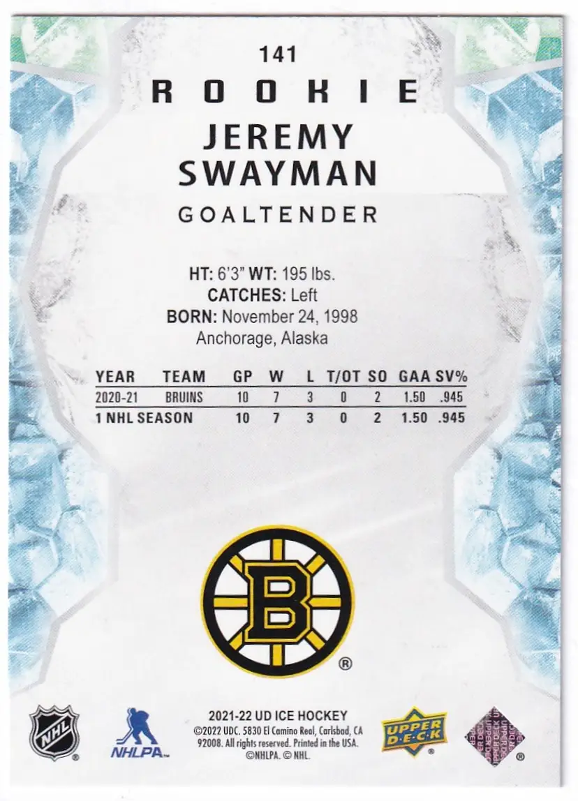2021-22 Upper Deck Ice #141 Jeremy Swayman RC Boston Bruins