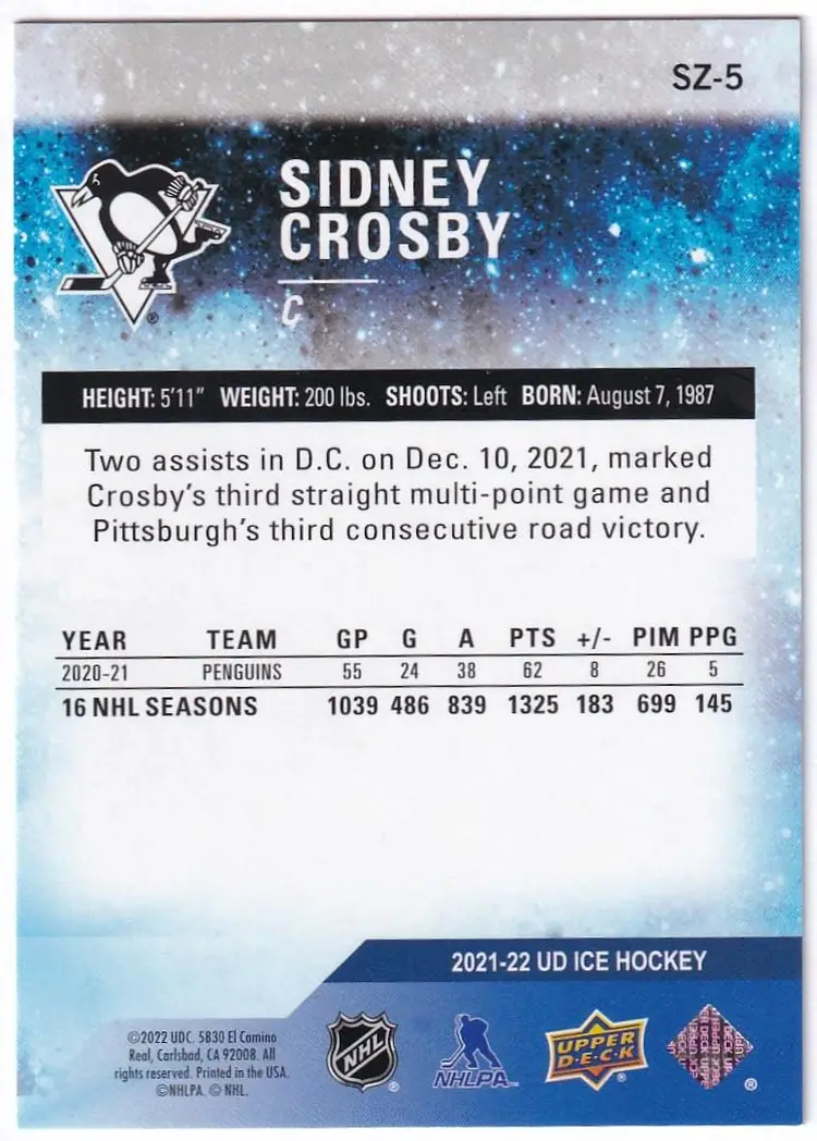 2021-22 Upper Deck Ice Sub Zero #SZ5 Sidney Crosby Pittsburgh Penguins