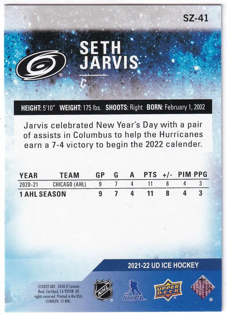 2021-22 Upper Deck Ice Sub Zero #SZ41 Seth Jarvis Carolina Hurricanes Print Run - 999