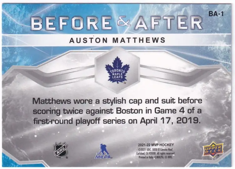 2021-22 Upper Deck MVP Before and After Gold #BA1 Auston Matthews Toronto Maple Leafs