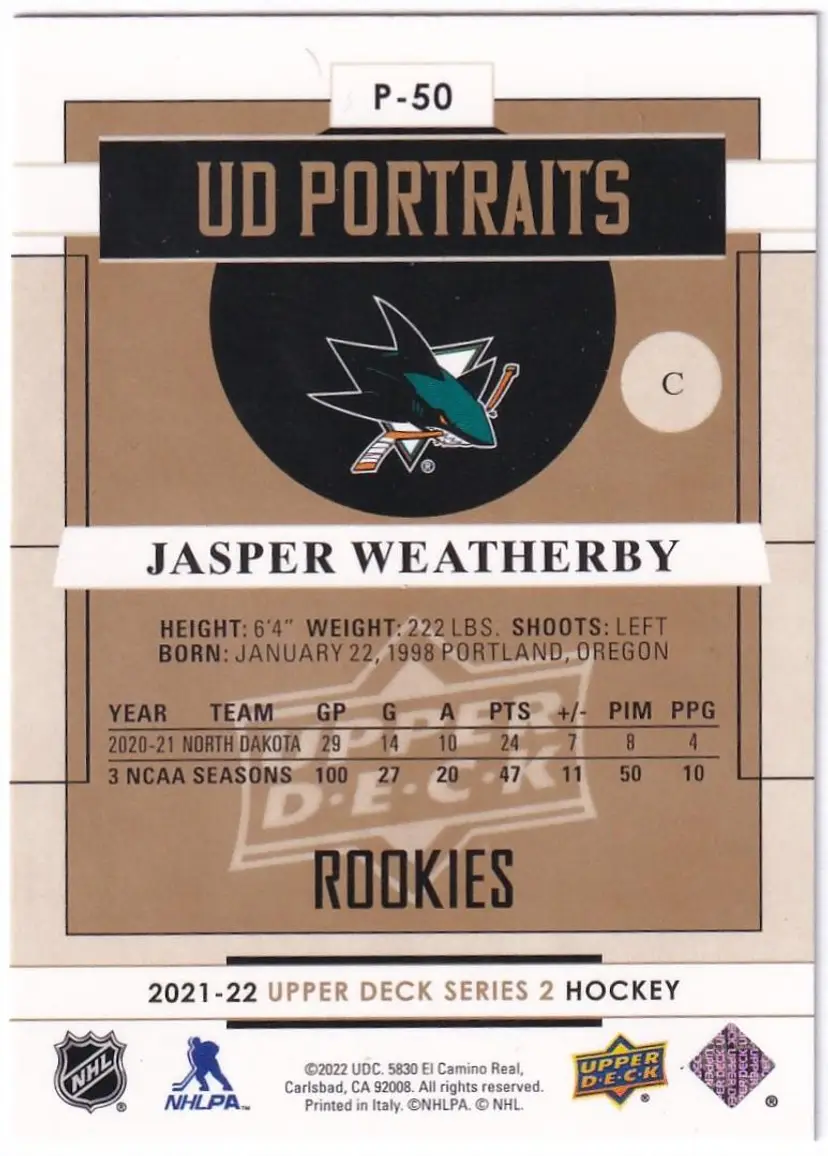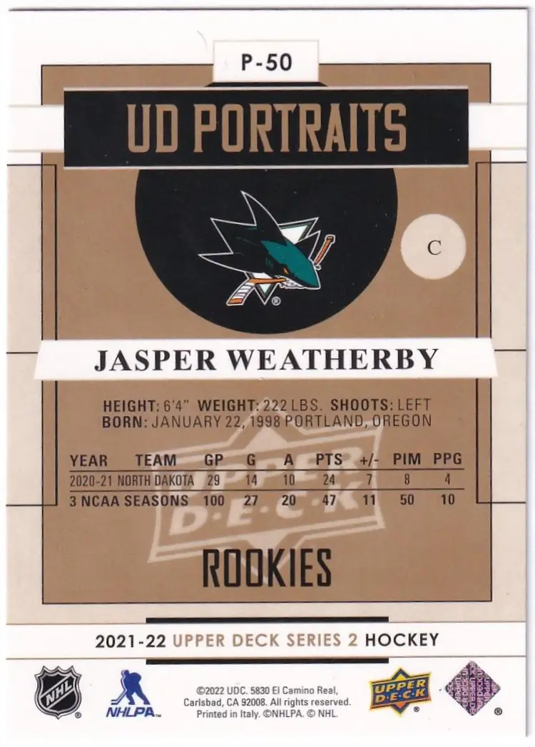 2021-22 Upper Deck Portraits #P50 Jasper Weatherby San Jose Sharks