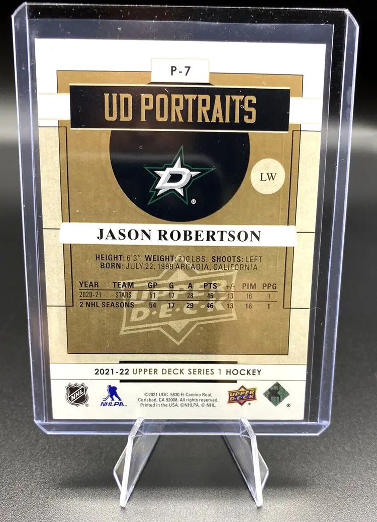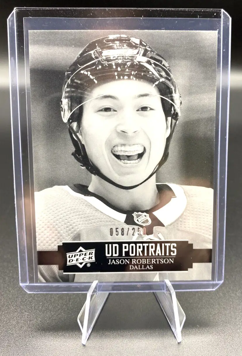 Returns Accepted: ReturnsNotAccepted Autographed: No League: National Hockey League (NHL) Set: 2021-22 Upper Deck Series 1 Print Run: 250 Player/Athlete: Jason Robertson Year Manufactured: 2021 Vintage: No Type: Sports Trading Card Sport: Ice Hockey Parallel/Variety: Black & White Manufacturer: Upper Deck Team: Dallas Stars Card Number: P-7 Season: 2021-22 Country/Region of Manufacture: United States