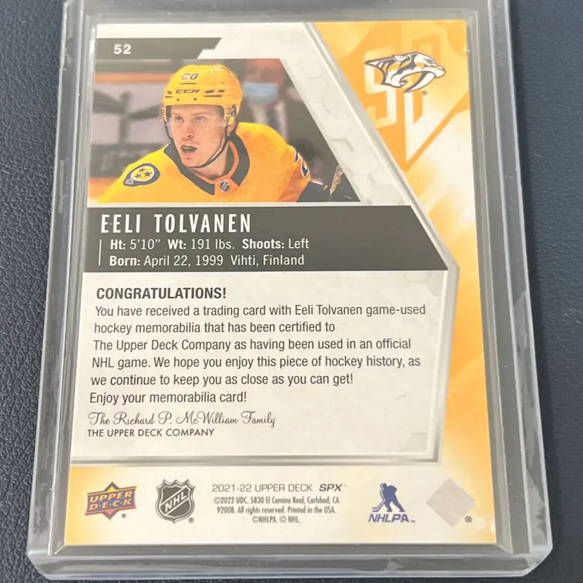2021-22 Upper Deck SPx Eeli Tolvanen Relic Nashville Predators
