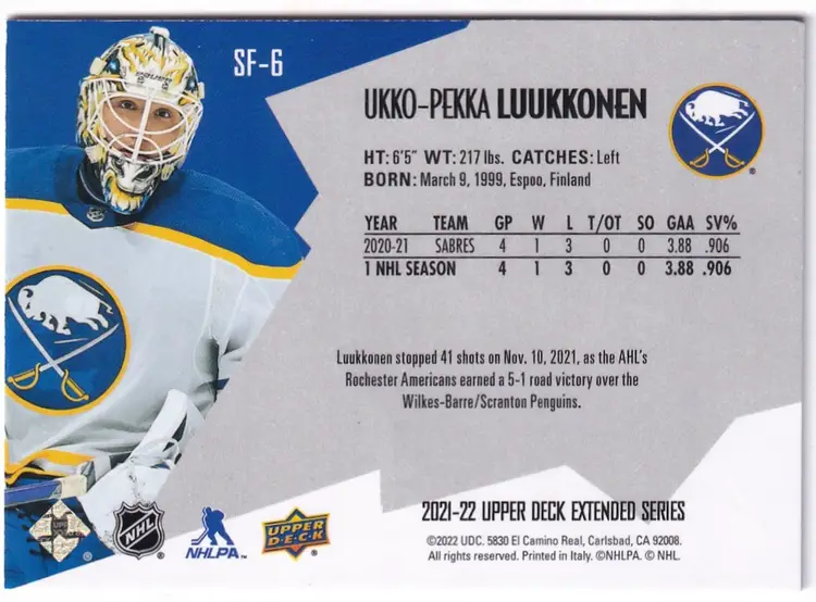 2021-22 Upper Deck SPx Finite Radiance #SF6 Ukko-Pekka Luukkonen Buffalo Sabres Print Run - 799