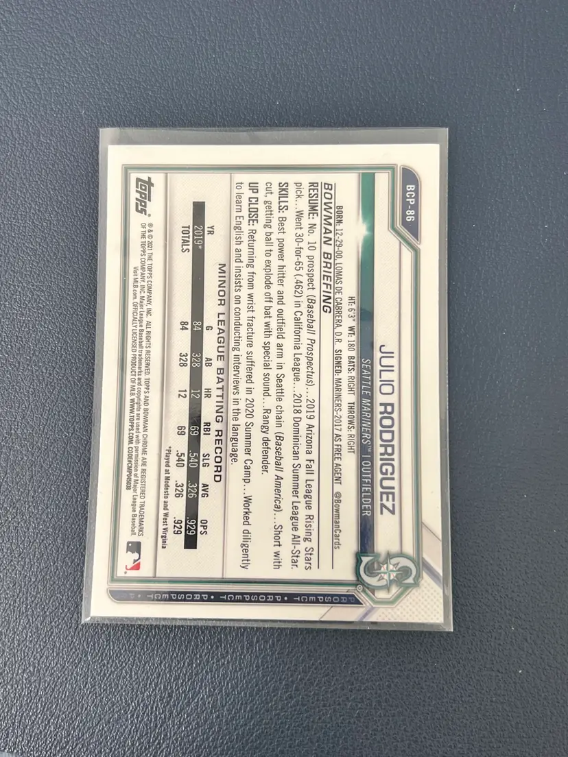 2021 Bowman Chrome Sapphire Julio Rodriguez Prospect #BCP-86 Seattle Mariners