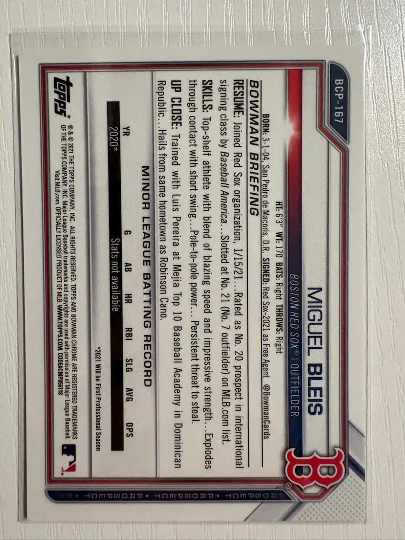 2021 Bowman Chrome Sapphire Miguel Bleis 1st Bowman Yellow Sapphire Refractor 44/50 Boston Red Sox