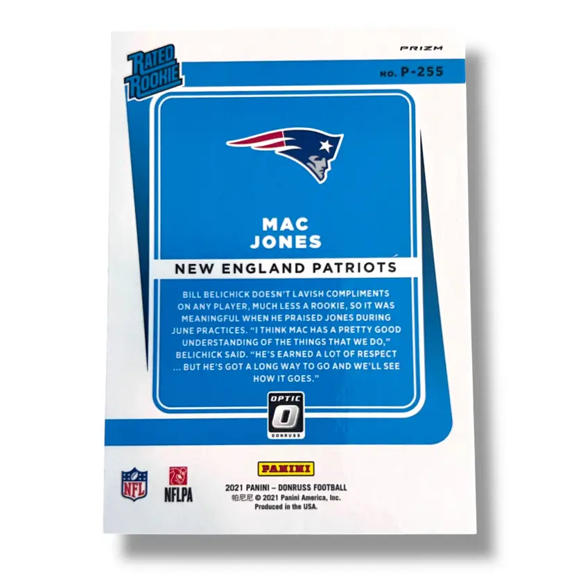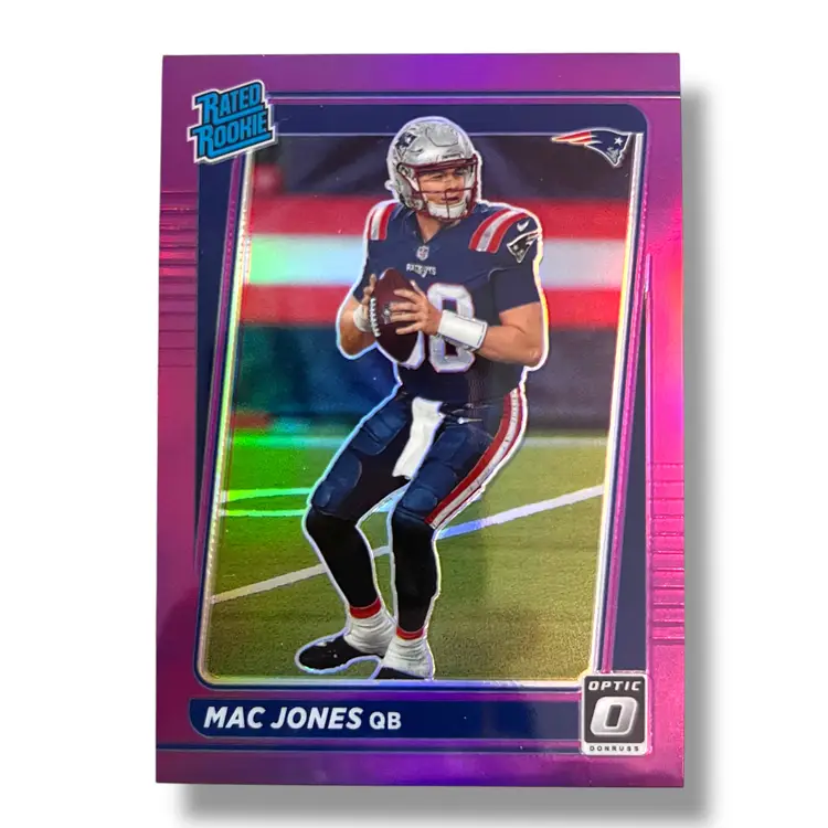 Here We Have a 2021 Donruss Mac Jones Optic Rated Rookie Preview Purple #P-255