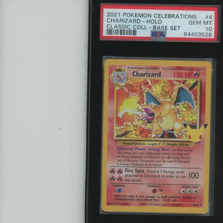 The product is a 2021 Pokémon Celebrations Charizard card graded as a PSA 10, signifying it is in mint condition. This English-language card from the Base Set features a holographic finish and is considered a Stage 2 Pokémon in the Pokémon Trading Card Game. With its professional grading by PSA, this Charizard card is highly sought after by collectors and fans of the popular franchise.