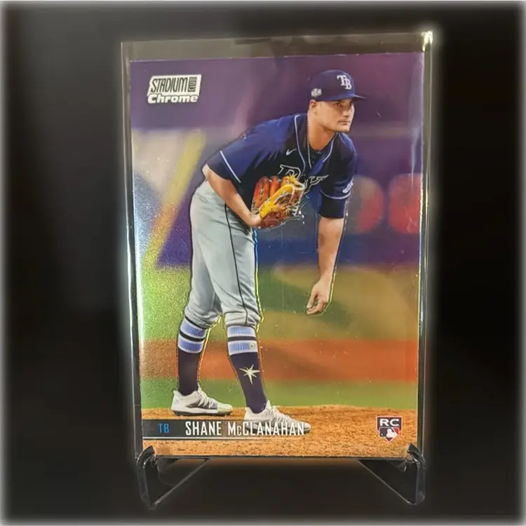 Print line on this card when looking under a light. You can see line from his glove, straight down in front of his leg.