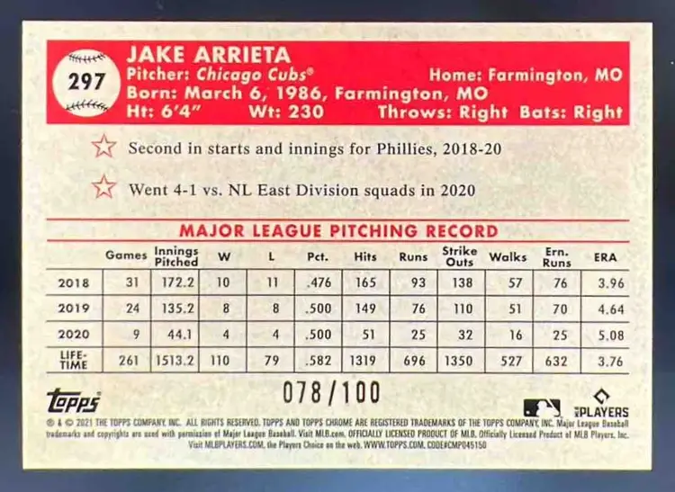 2021 Topps Chrome Platinum Anniversary Jake Arrieta Red Atomic Refractor /100 #297 Cubs