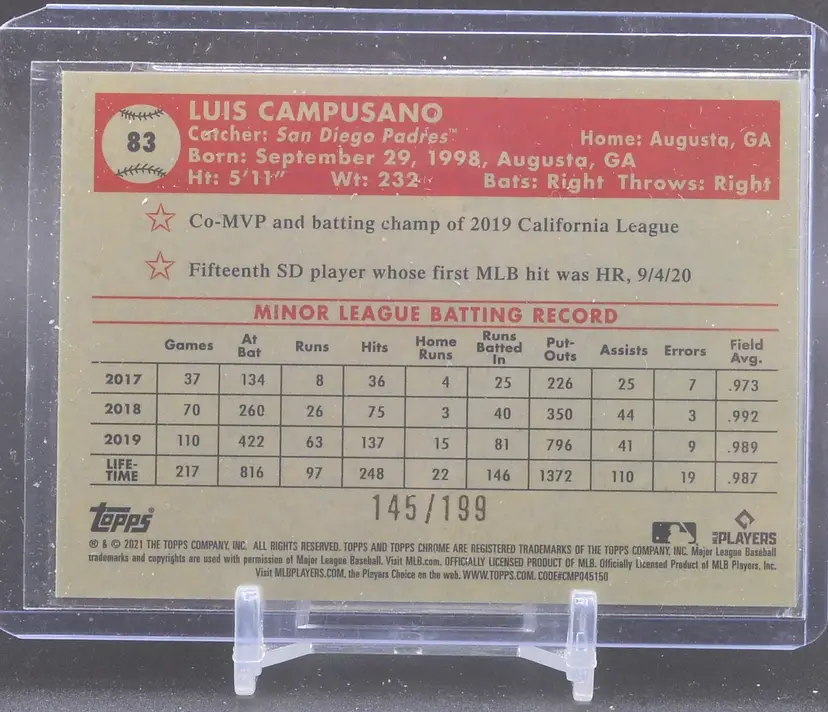 2021 Topps Chrome Platinum Blue Mini-Diamond, Luis Campusano RC, San Diego Padres