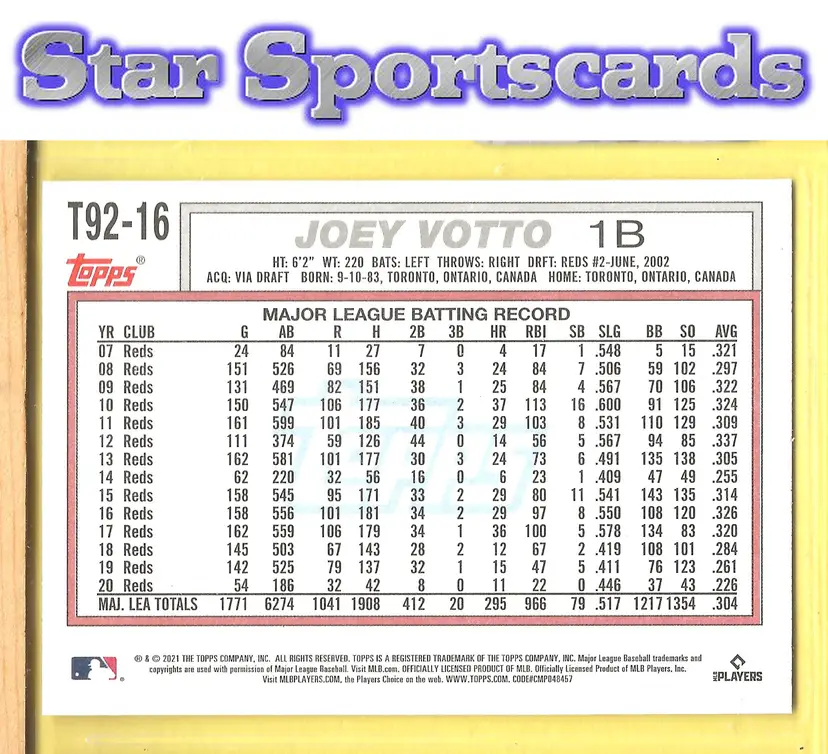 This is a nice example of a 2021 Topps Update #T92-16 Joey Votto 1992 Topps Redux .Other important information about this card: In Joey Votto played for the Cincinnati Reds.Please check out our other listings for more great cards.