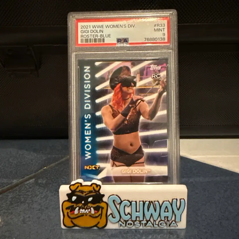 The product is a 2021 WWE Women's Division Gigi Dolin rookie card, also known as Priscilla Kelly, graded a PSA 9. This sports trading card is part of the 2021 Topps WWE Women's Division set and features a Roster Blue parallel variety. As a rookie card, this collectible item showcases the rising talent of Gigi Dolin within the WWE wrestling league, making it a valuable addition to any sports memorabilia or trading card collection.