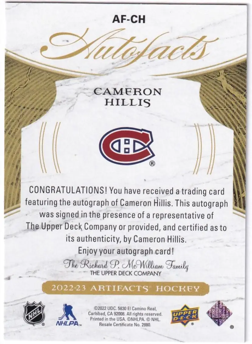 2022-23 Artifacts Autofacts #AFCH Cameron Hillis Montreal Canadiens