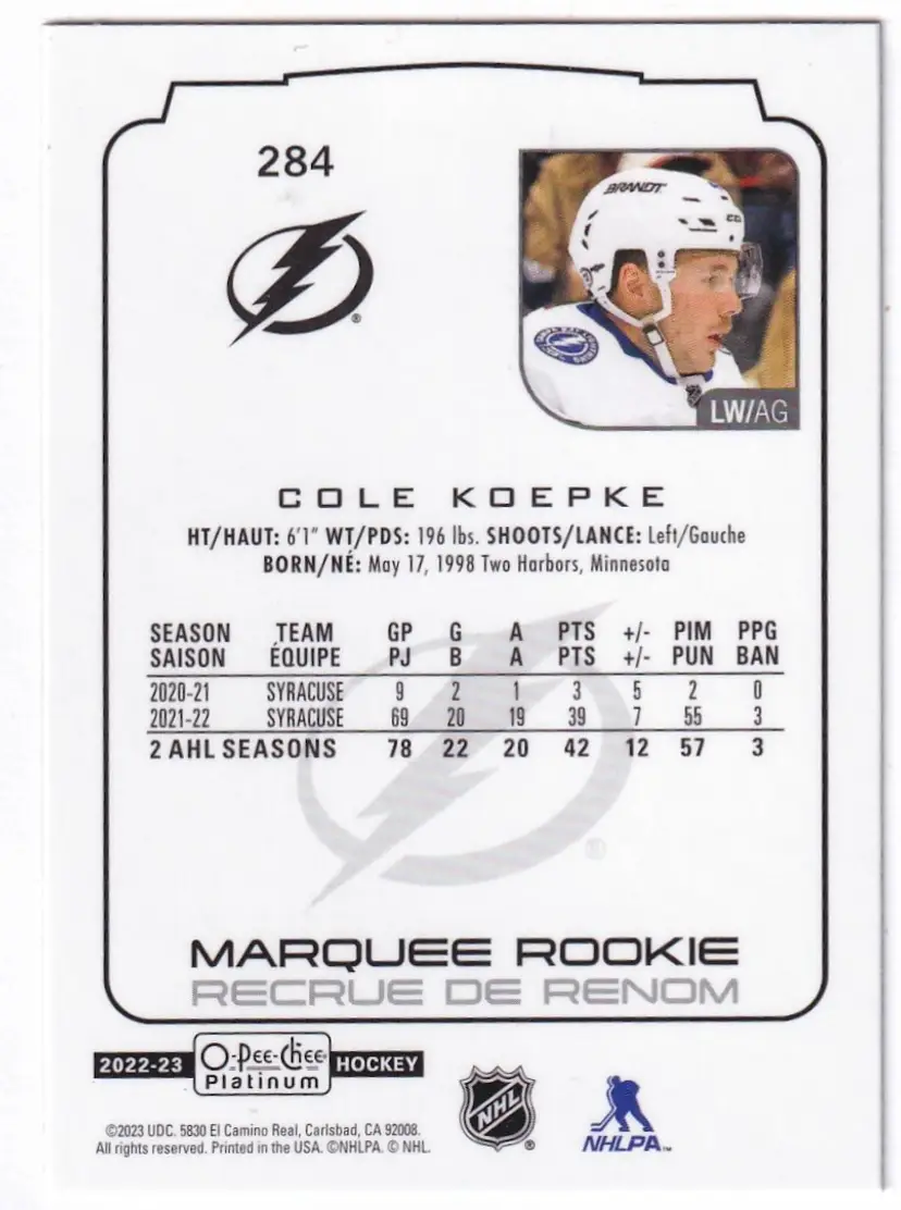 2022-23 O-Pee-Chee Platinum #284 Cole Koepke RC Tampa Bay Lightning