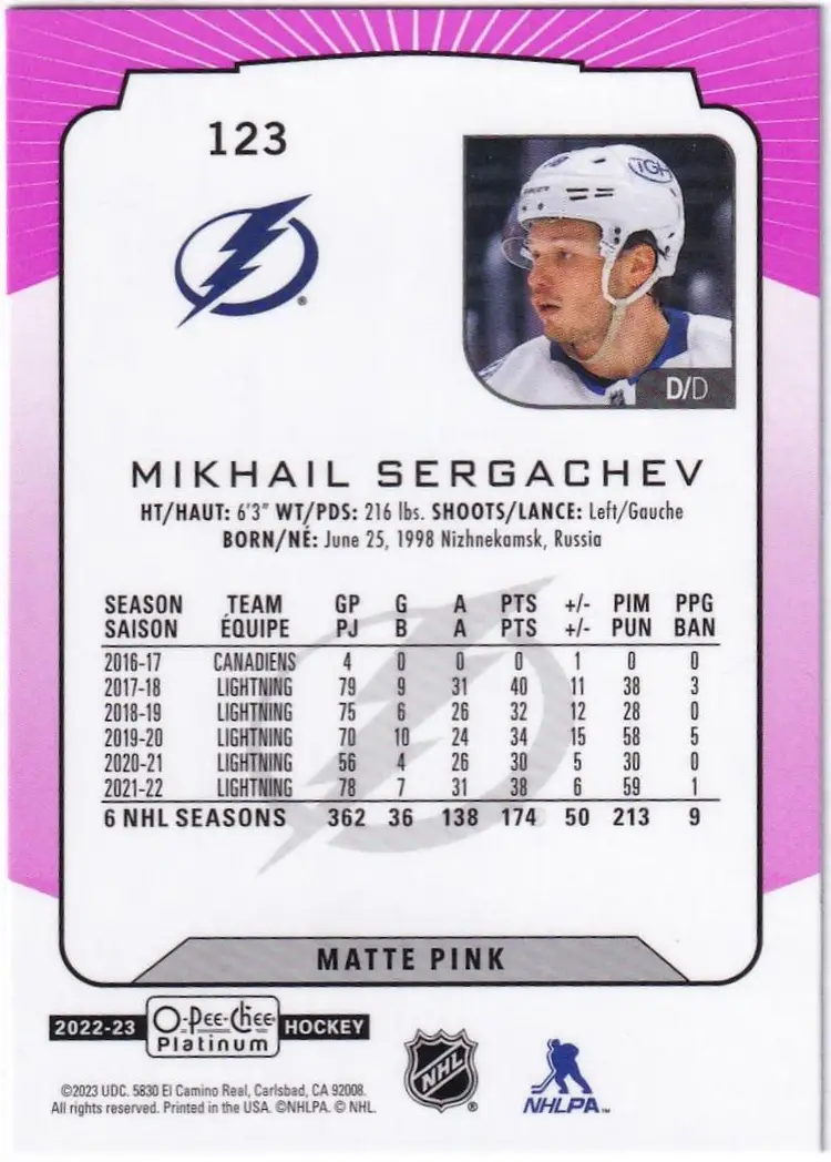 2022-23 O-Pee-Chee Platinum Matte Pink #123 Mikhail Sergachev Tampa Bay Lightning