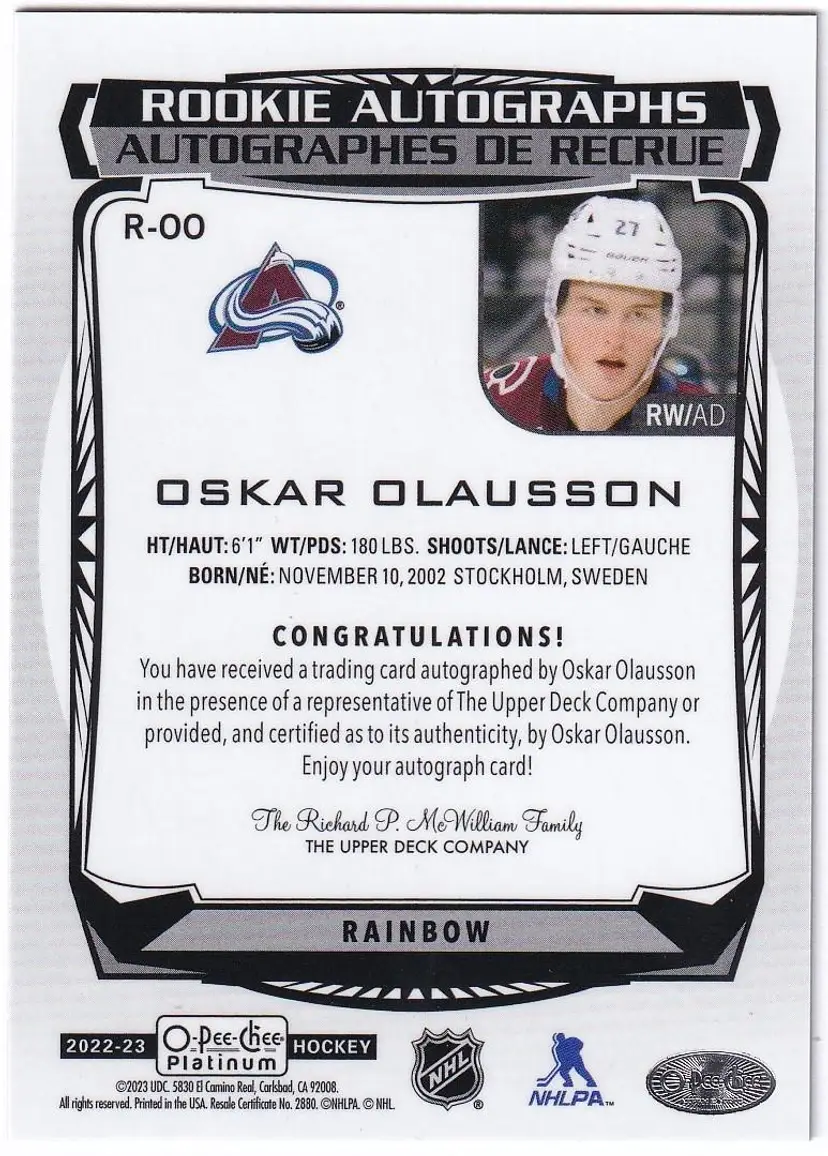 2022-23 O-Pee-Chee Platinum Rookie Autographs Rainbow #ROO Oskar Olausson Colorado Avalanche