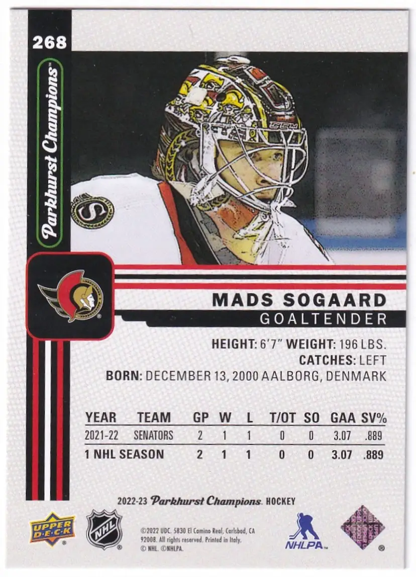 2022-23 Parkhurst Champions #268 Mads Sogaard RC Ottawa Senators