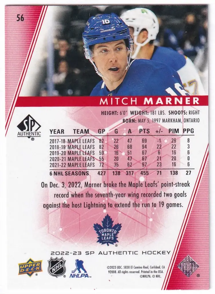 2022-23 SP Authentic Limited Red #56 Mitch Marner Toronto Maple Leafs